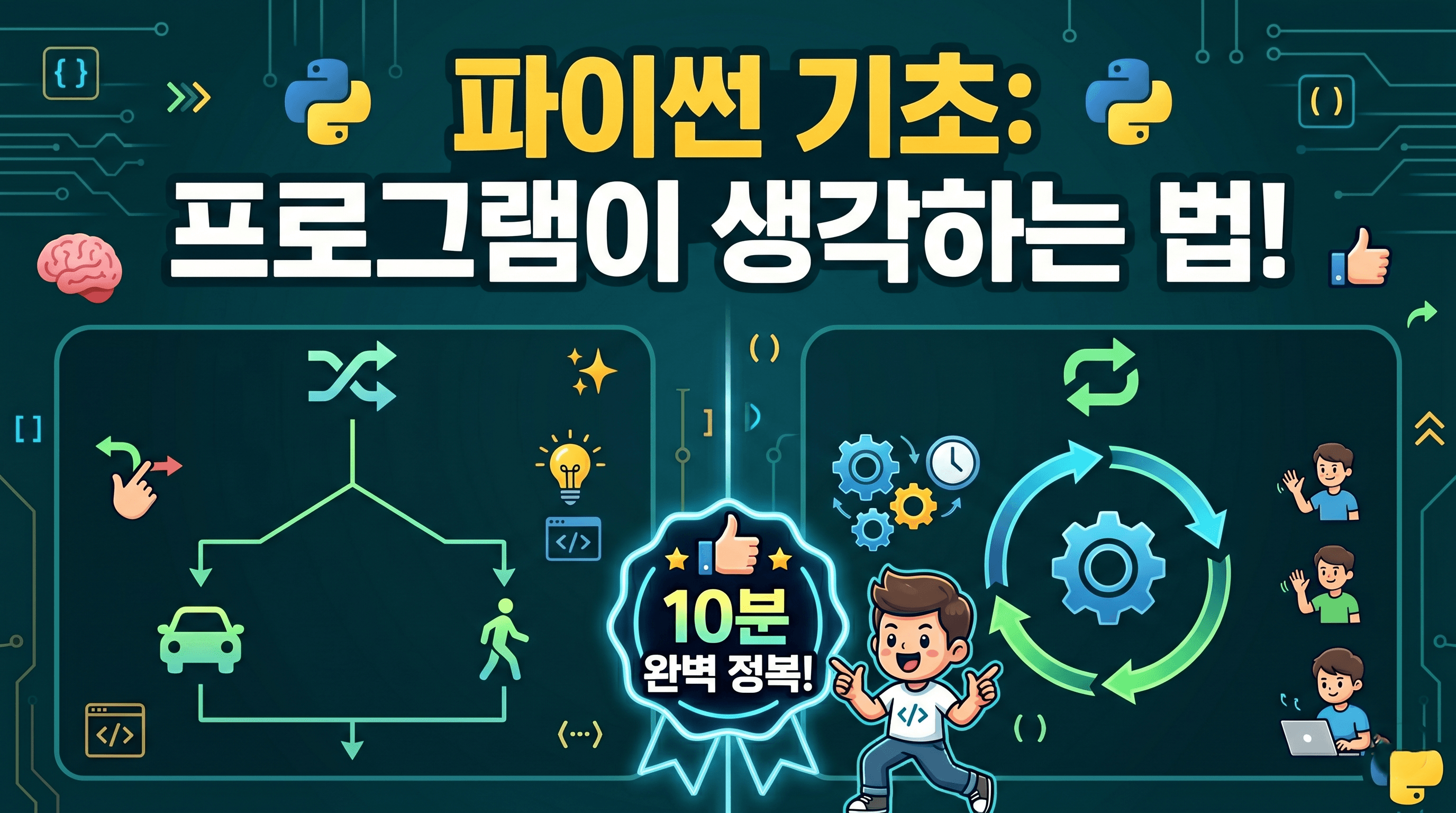 파이썬 기초에서 가장 중요한 '제어문(if문, for문)'의 원리를 코딩 초보자도 이해하기 쉽게 완벽 정리해 드립니다! 단순히 따라 치는 코딩은 그만! 프로그램이 스스로 생각하고 판단하게 만드는 마법 같은 제어 흐름의 비밀을 파헤쳐 봅니다. 이 강의에서는 파이썬의 필수 문법인 들여쓰기의 중요성부터, if/elif/else를 활용한 조건부 실행, 그리고 for문과 range() 함수를 이용한 반복 작업까지 다룹니다. 또한 break와 continue의 차이점, 그리고 실제 로그인 프로그램 예제를 통해 실무에서 어떻게 쓰이는지 직관적으로 보여드립니다. 코딩 독학하시는 분들, 이 영상 하나로 제어문은 졸업하세요! 💻✨